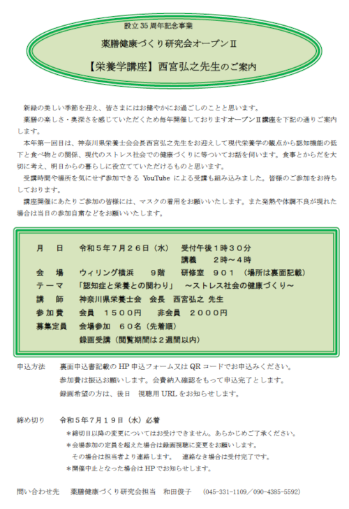本年第一回目は、神奈川県栄養士会会長西宮弘之先生をお迎えして現代栄養学の観点から認知機能の低下と食べ物との関係、現代のストレス社会での健康づくりに等ついてお話を伺います。食事とからだを大切に考え、明日からの暮らしに役立てていただけるものと思います。